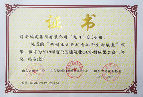 集團”旭日“QC小組完成的《研制土方開挖噴漆降塵新裝置》成果被評為“2019年度全省建筑業(yè)QC小組成果競賽二等獎