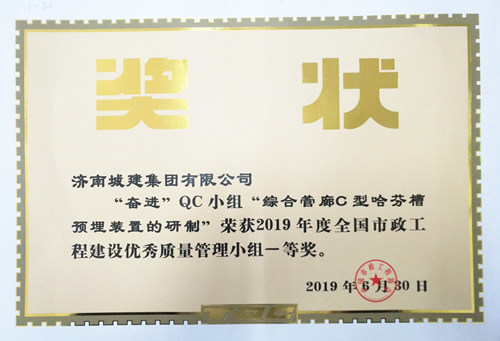 集團“奮進”QC小《綜合管廊C型哈芬槽預(yù)埋裝置的研制》榮獲“2019年度全國市政工程建設(shè)優(yōu)秀質(zhì)量管理小組一等獎”