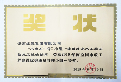 集團(tuán)“木魚石”QC小組《降低現(xiàn)澆水工構(gòu)筑物施工縫缺陷率》榮獲“2019年度全國市政工程建設(shè)優(yōu)秀質(zhì)量管理小組一等獎”
