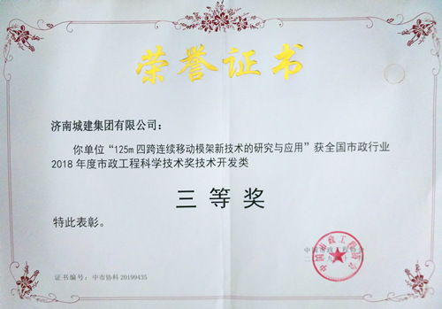 集團(tuán)《125m四跨連續(xù)移動模架新技術(shù)的研究與應(yīng)用》榮獲“2018年度市政工程科學(xué)技術(shù)獎(jiǎng)技術(shù)開發(fā)類三等獎(jiǎng)”