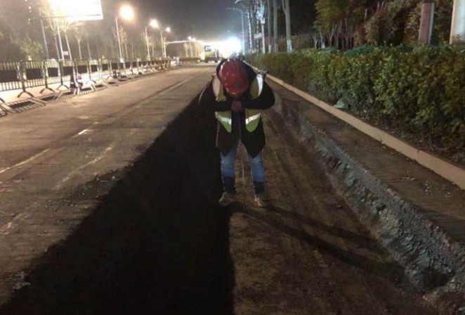 任務(wù)緊急、刻不容緩。項(xiàng)目部開工即沖鋒,倒排工期,快速組織,針對(duì)港西路現(xiàn)狀施工條件及交通狀況,反復(fù)優(yōu)化施工方案、合理安排施工工序,全力以赴投入施工,僅用四天就把主線溝槽全部打通。施工中堅(jiān)持標(biāo)準(zhǔn)、嚴(yán)守底線,為確保美觀,將瀝青接縫全部設(shè)置在標(biāo)線下;為避免施工工期加長(zhǎng),所有與地下管線沖突位置均根據(jù)給水安裝規(guī)范進(jìn)行管道順接,盡量不使用鋼制彎頭焊接。針對(duì)施工難點(diǎn),項(xiàng)目部積極協(xié)同監(jiān)理、安裝單位、建設(shè)單位召開討論會(huì),并嚴(yán)格按確定方案落實(shí),主動(dòng)協(xié)助供水管道安裝隊(duì)伍解決進(jìn)度慢的問(wèn)題,共同提升施工進(jìn)展。